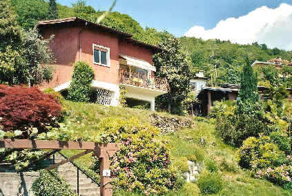 view from the garden the detached house ( approx. 40 square metre ) for 2 persons with southly sunny terrace to the lake consists of: 1 twin-bedded room, 1 living- and dining room and a large window to the Lago Maggiore and kitchen. From the hall you can attain a shower-room with WC. The house is surrounded by a garden in slope situation. All commonly used household-utensiles are present. Satellite-TV is existing. A parking place is next to the house.